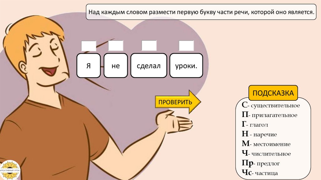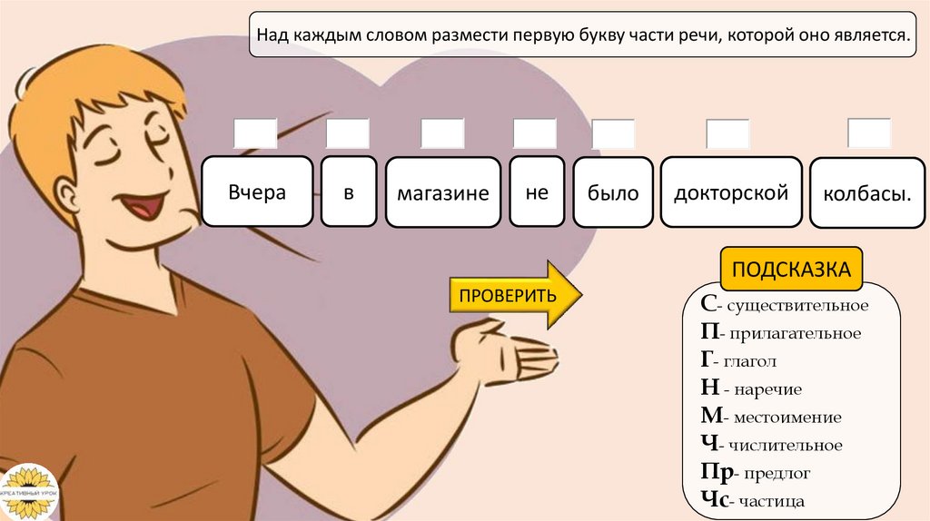 Над каждым словом размести первую букву части речи, которой оно является.Я