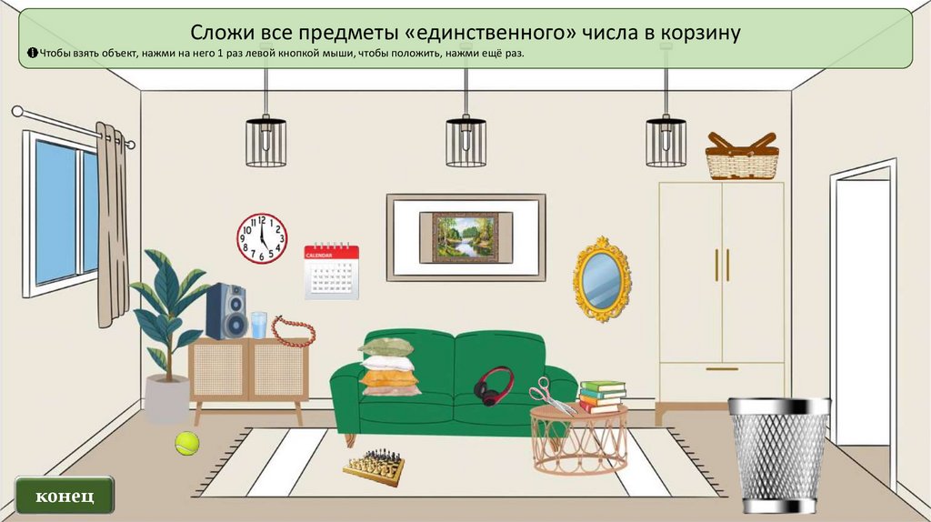 Сложи все предметы «единственного» числа в корзинуЧтобы взять объект, нажми на него 1 раз левой кнопкой мыши, чтобы положить, нажми ещё раз.