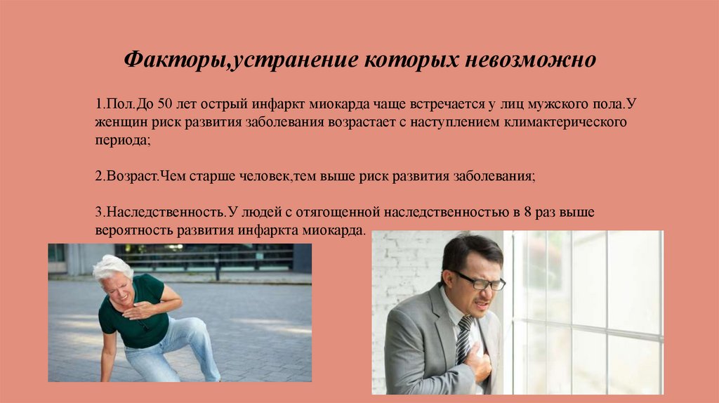 Факторы,устранение которых невозможно1.Пол.До 50 лет острый инфаркт миокарда чаще встречается у лиц мужского пола.У