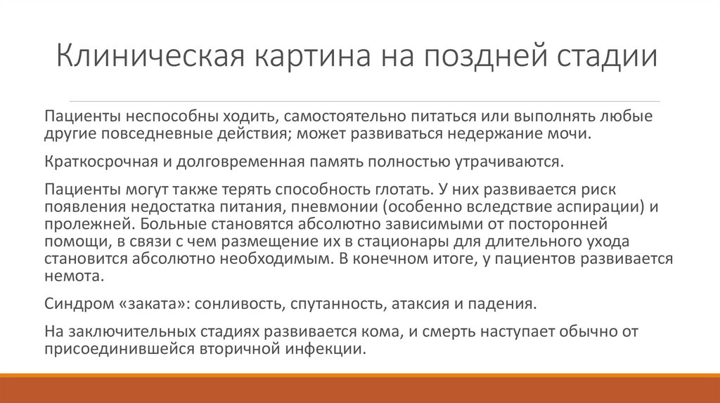 Клиническая картина на поздней стадииПациенты неспособны ходить, самостоятельно питаться или выполнять любые