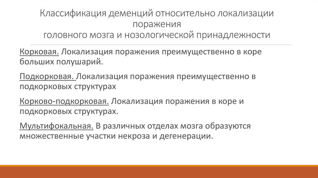 Классификация деменций относительно локализациипоражения
