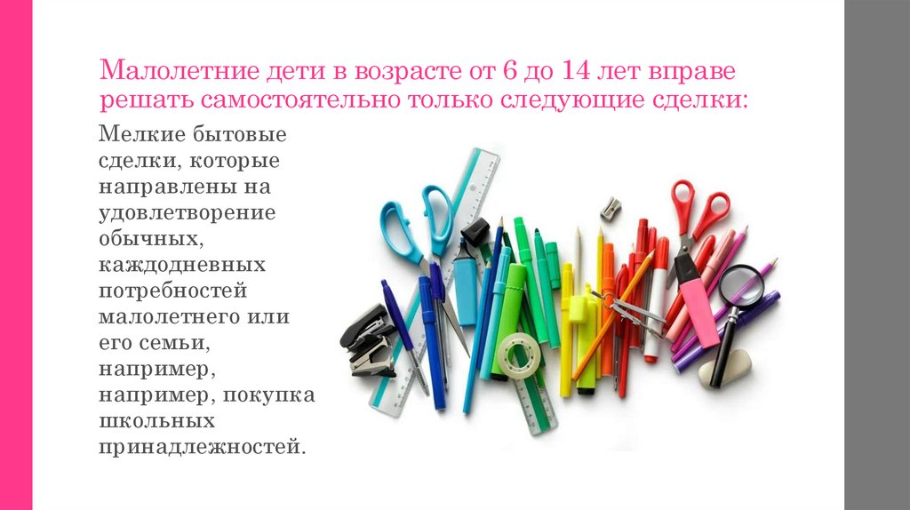 Малолетние дети в возрасте от 6 до 14 лет вправерешать самостоятельно только следующие сделки: