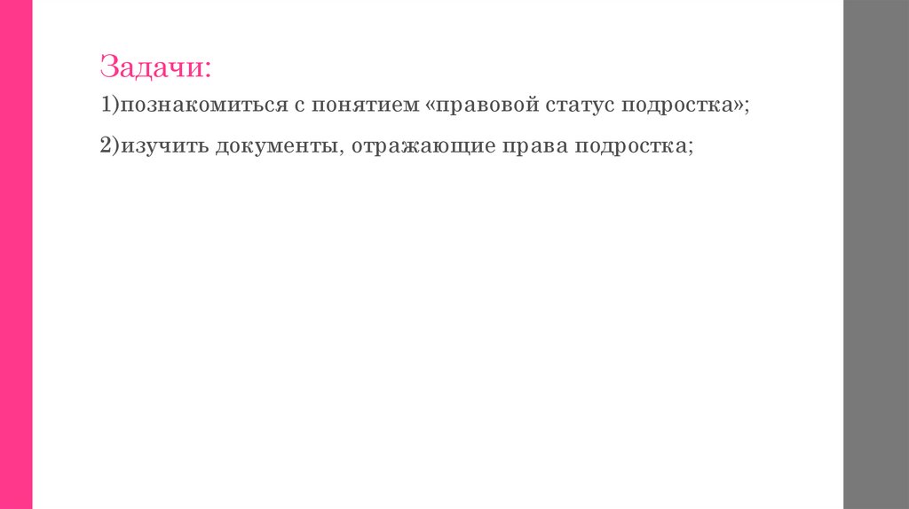 Задачи:1)познакомиться c понятием «правовой статус подростка»;