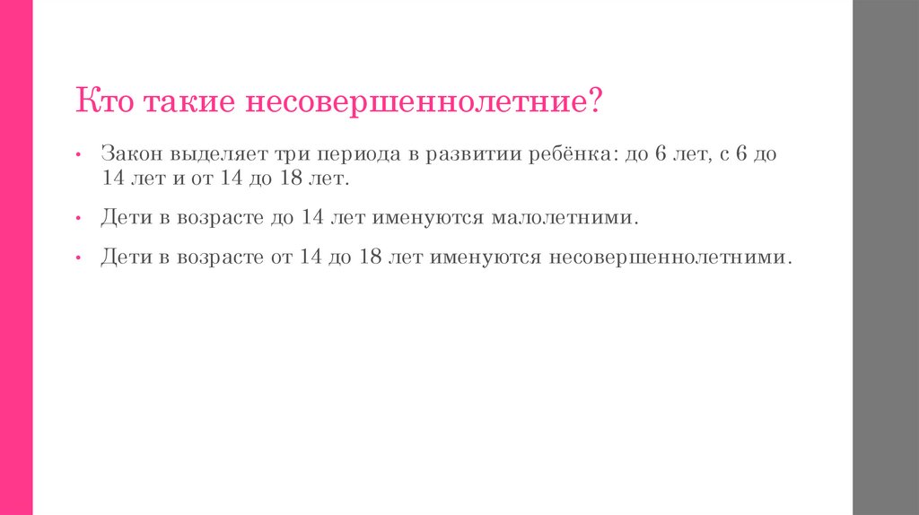 Кто такие несовершеннолетние?Закон выделяет три периода в развитии ребёнка: до 6 лет, с 6 до