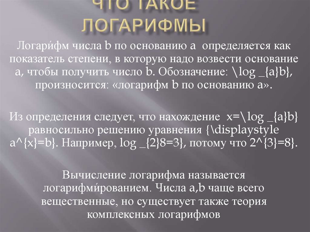 Логари́фм числа b по основанию a определяется какпоказатель степени, в которую надо возвести основание