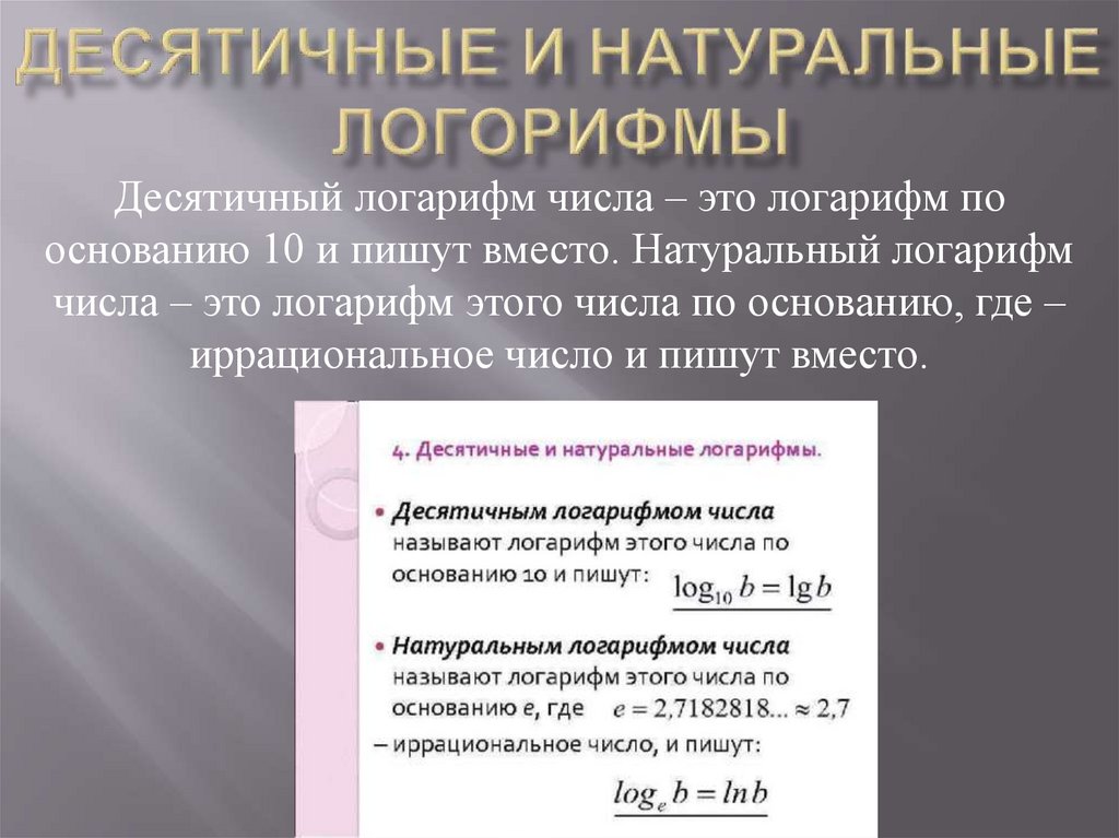 Десятичный логарифм числа – это логарифм пооснованию 10 и пишут вместо. Натуральный логарифм