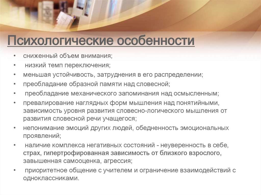 Психологические особенностисниженный объем внимания;