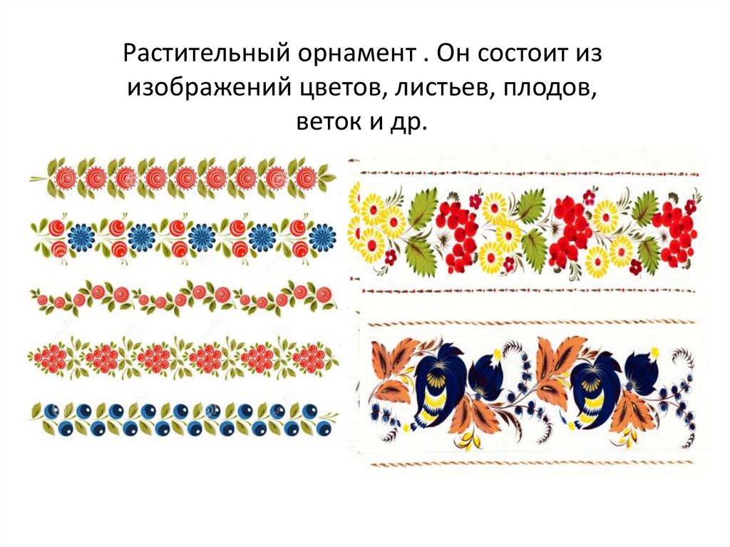 Растительный орнамент . Он состоит изизображений цветов, листьев, плодов,