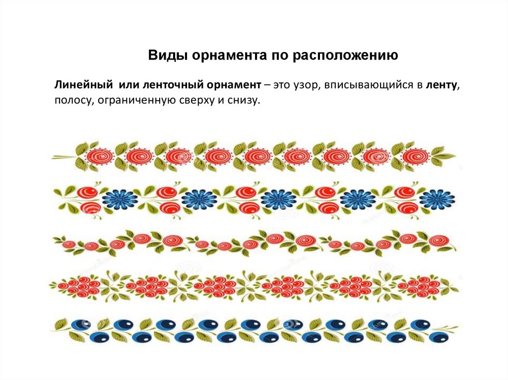 Виды орнамента по расположениюЛинейный или ленточный орнамент – это узор, вписывающийся в ленту,