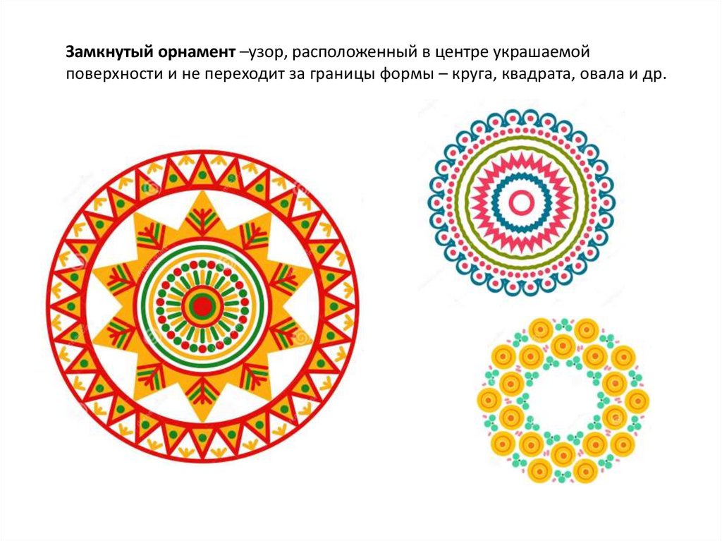 Замкнутый орнамент –узор, расположенный в центре украшаемойповерхности и не переходит за границы формы – круга, квадрата, овала и др.