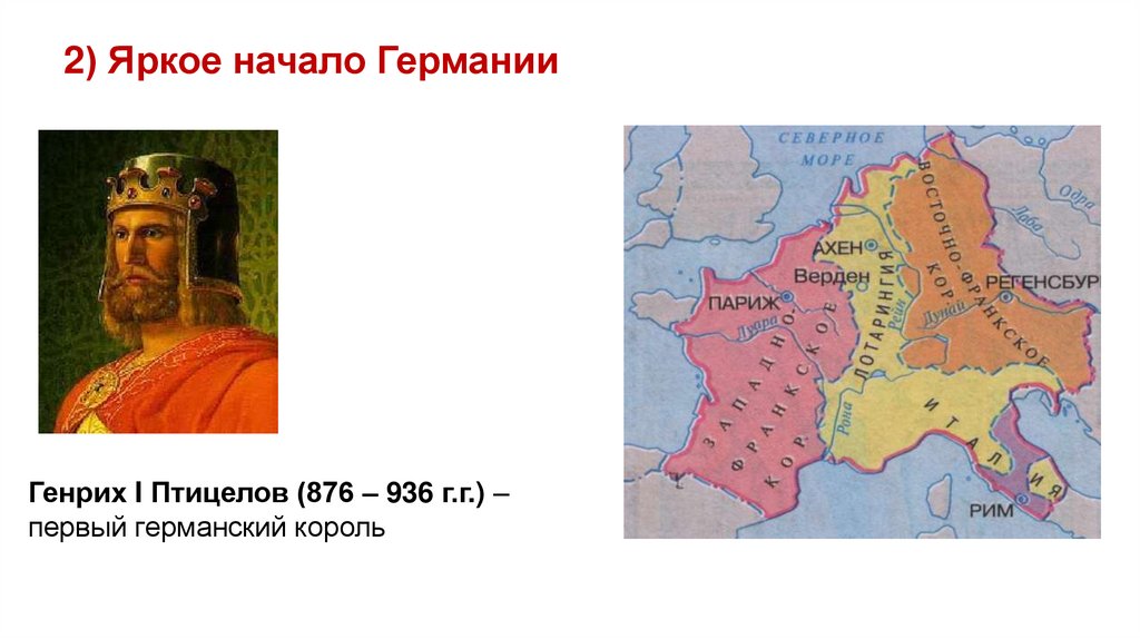 2) Яркое начало ГерманииГенрих I Птицелов (876 – 936 г.г.) –