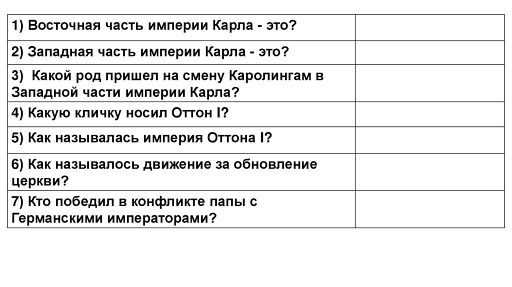 1) Восточная часть империи Карла - это?2) Западная часть империи Карла - это?