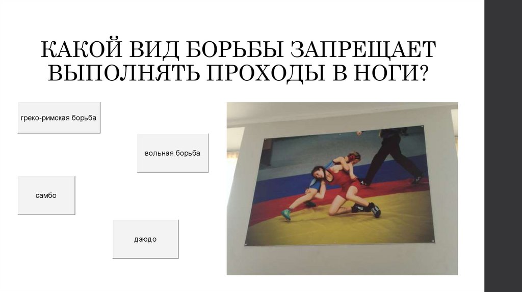 КАКОЙ ВИД БОРЬБЫ ЗАПРЕЩАЕТВЫПОЛНЯТЬ ПРОХОДЫ В НОГИ?