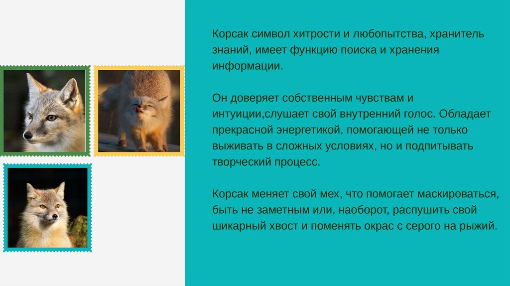Корсак символ хитрости и любопытства, хранительзнаний, имеет функцию поиска и хранения
