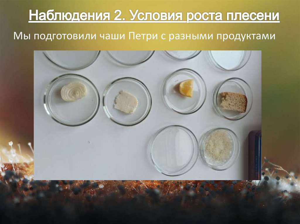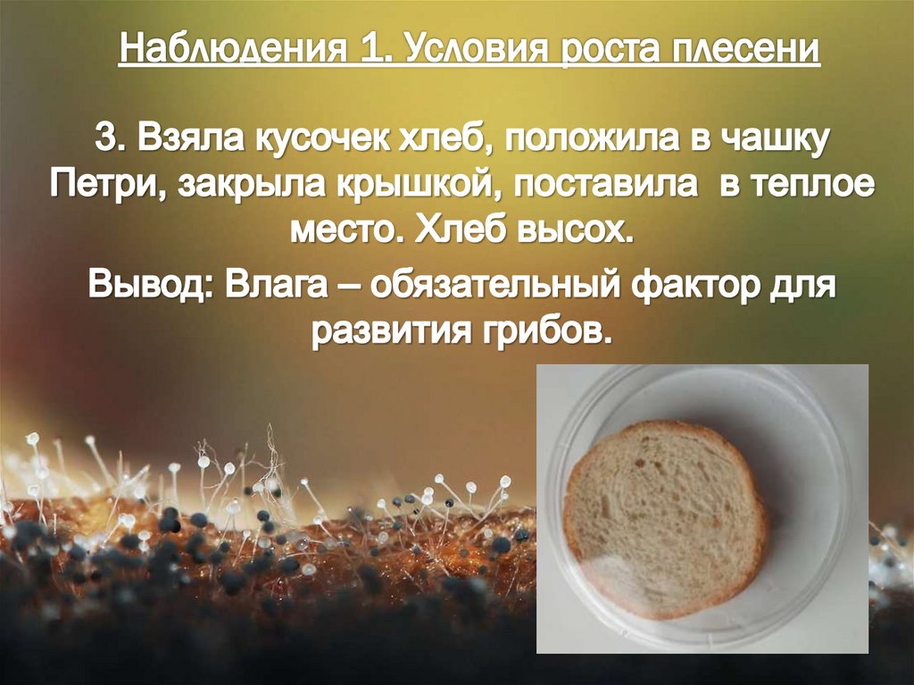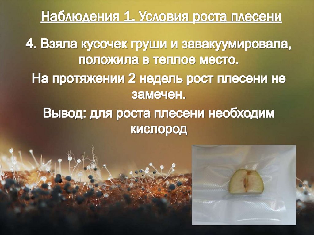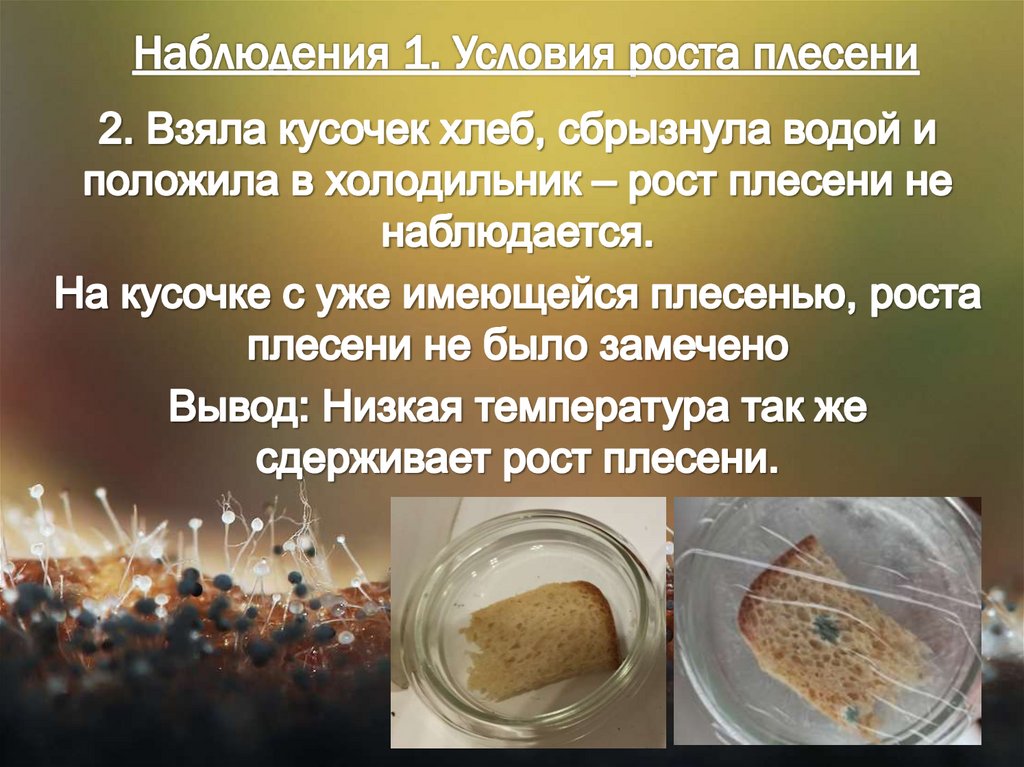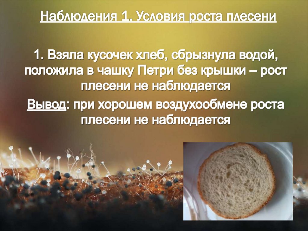 Я провела несколько опытов, доказав, какие условиянужны для роста плесени, а при каких условиях она