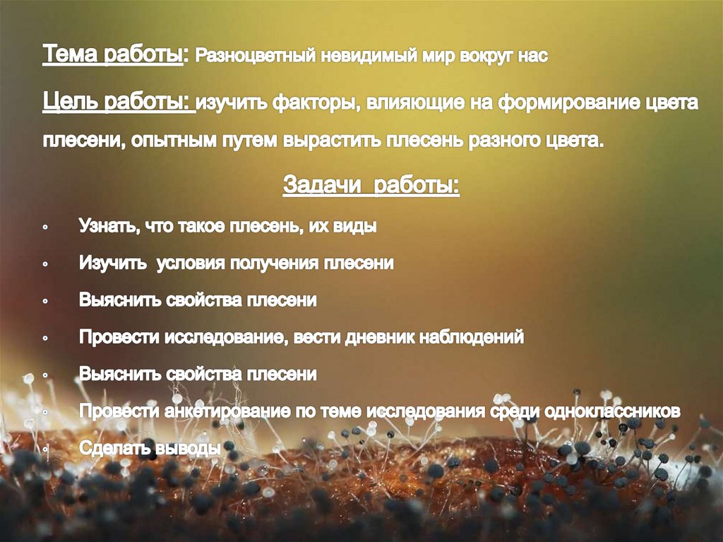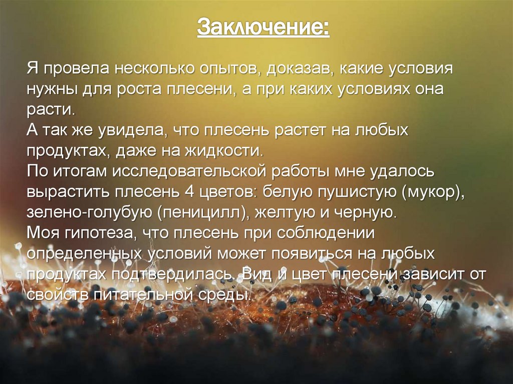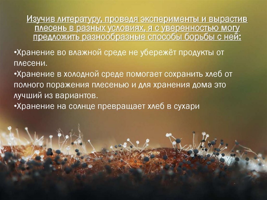 Изучив литературу, проведя эксперименты и вырастивплесень в разных условиях, я с уверенностью могу