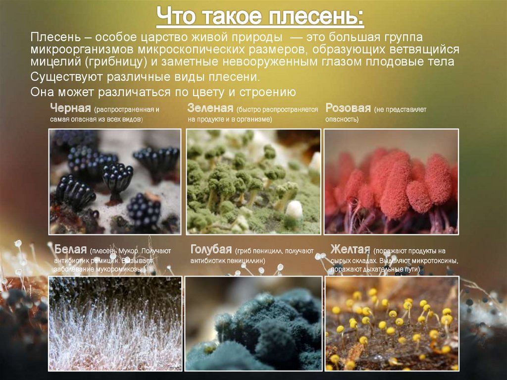 Плесень – особое царство живой природы — это большая группамикроорганизмов микроскопических размеров, образующих ветвящийся