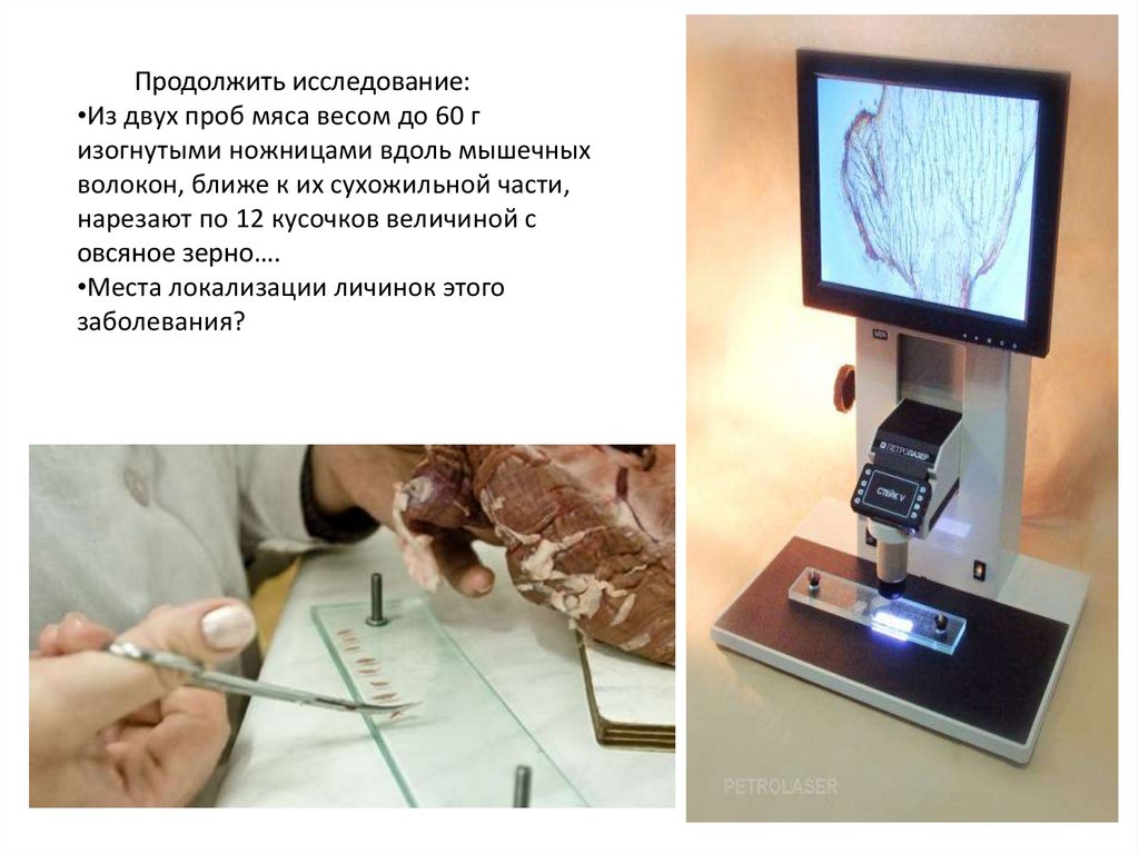 Продолжить исследование:•Из двух проб мяса весом до 60 г