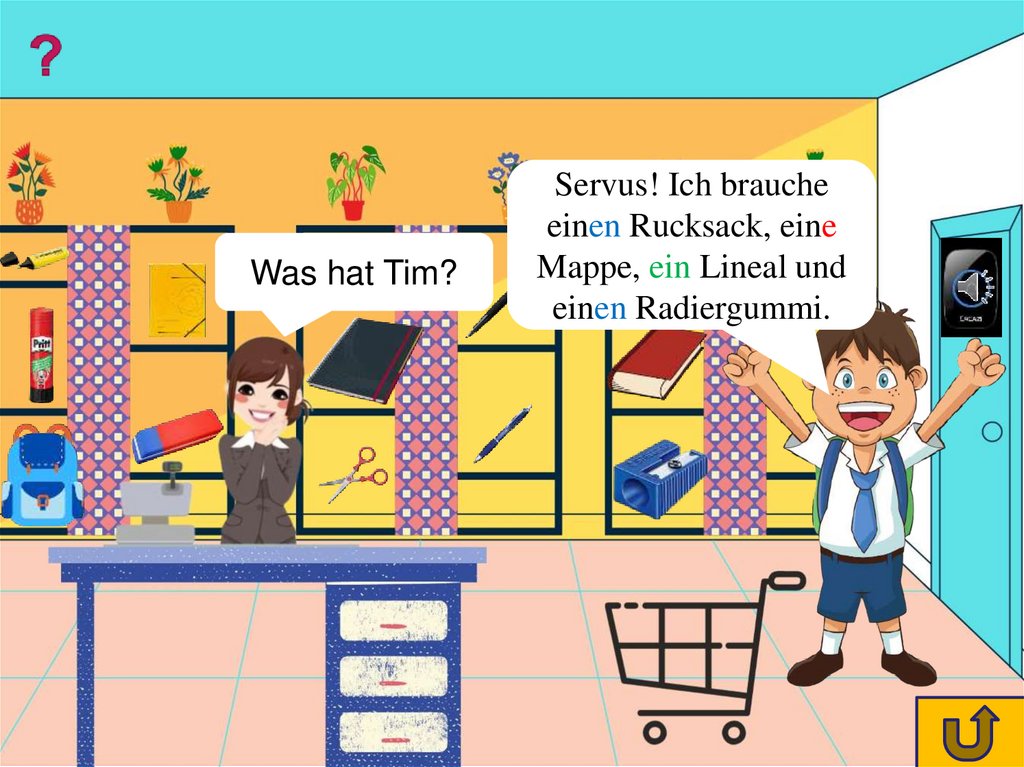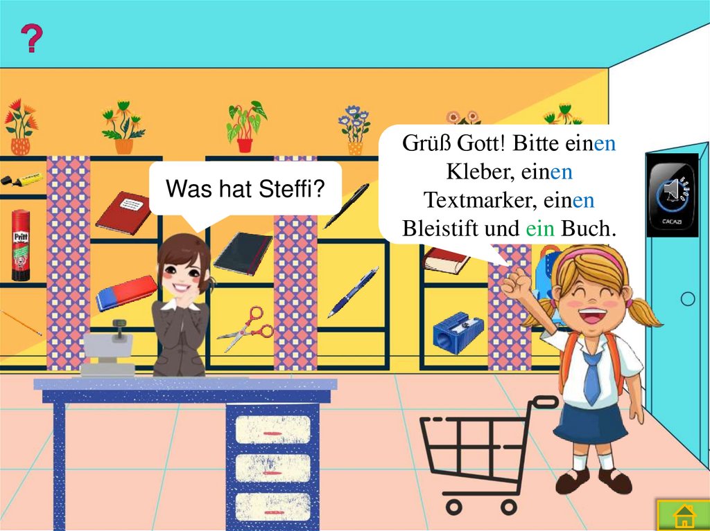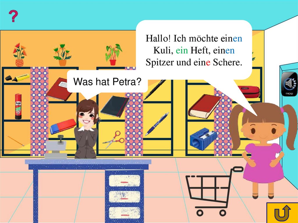 Hallo! Ich möchte einenKuli, ein Heft, einen