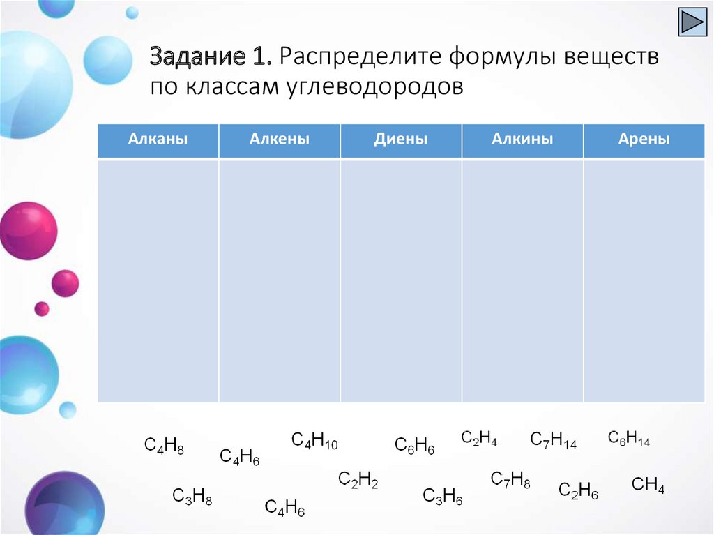 Задание 1. Распределите формулы веществпо классам углеводородов