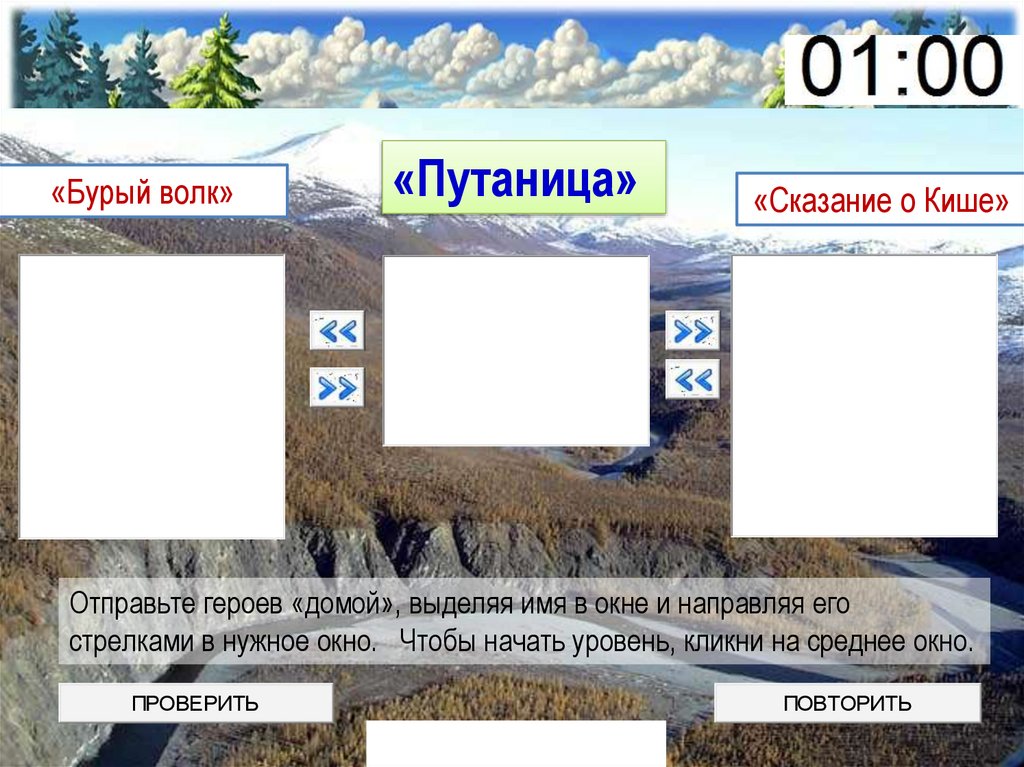 стрелками в нужное окно. Чтобы начать уровень, кликни на среднее окно.