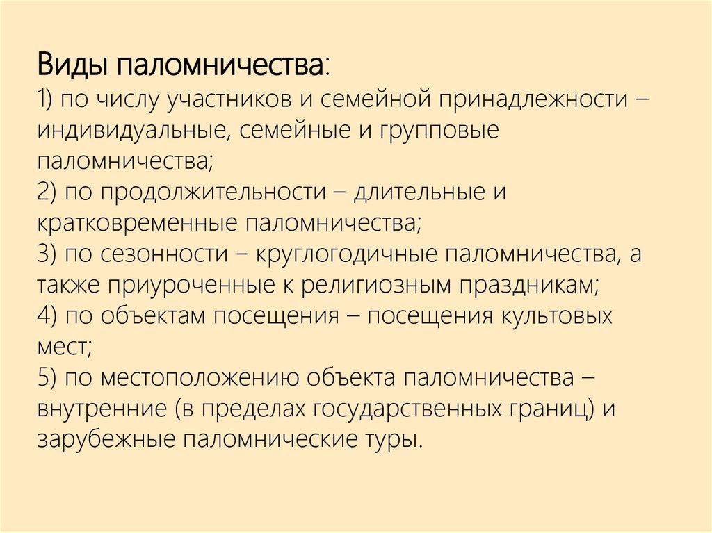 Виды паломничества:1) по числу участников и семейной принадлежности –