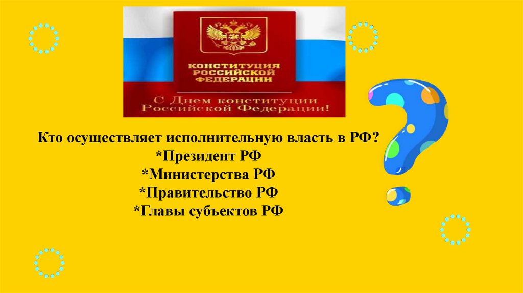 Кто осуществляет исполнительную власть в РФ?*Президент РФ