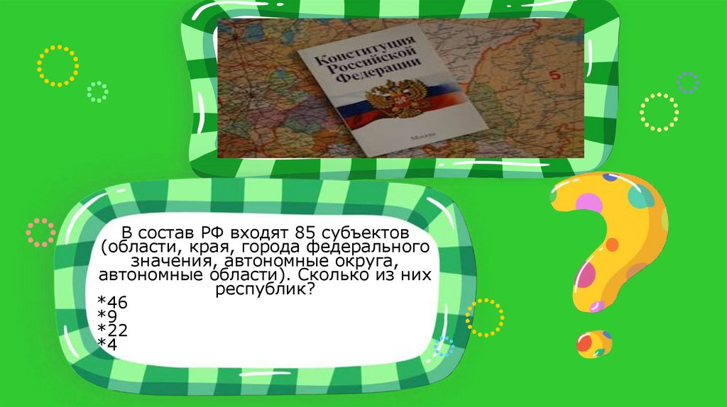 В состав РФ входят 85 субъектов(области, края, города федерального