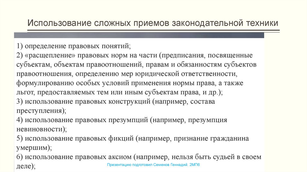 Использование сложных приемов законодательной техники1) определение правовых понятий;