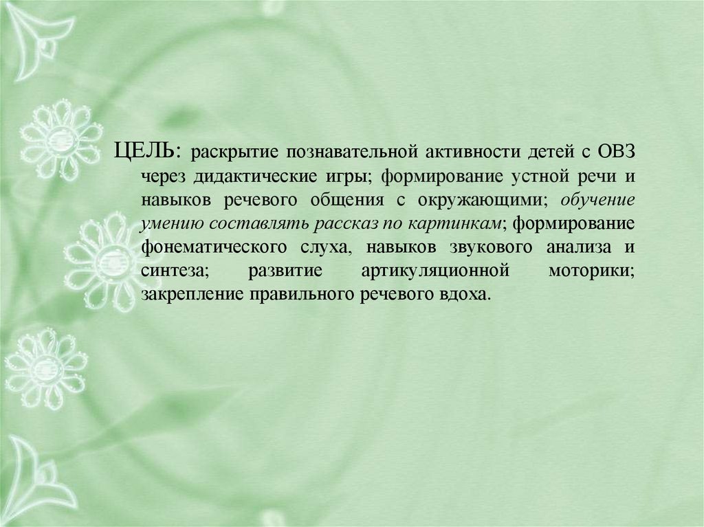 ЦЕЛЬ: раскрытие познавательной активности детей с ОВЗчерез дидактические игры; формирование устной речи и