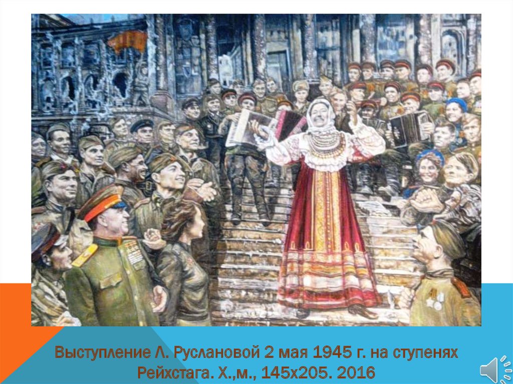 Выступление Л. Руслановой 2 мая 1945 г. на ступеняхРейхстага. Х.,м., 145х205. 2016