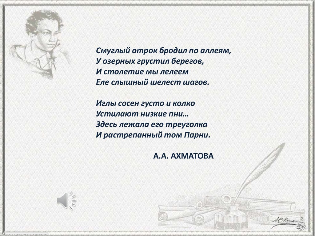 Смуглый отрок бродил по аллеям,У озерных грустил берегов,