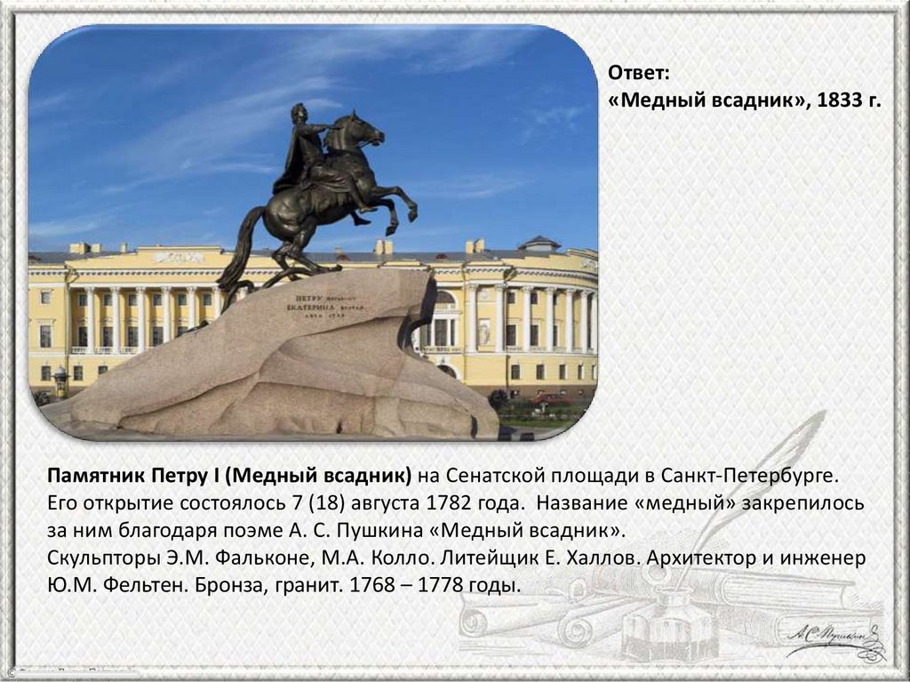 Скульпторы Э.М. Фальконе, М.А. Колло. Литейщик Е. Халлов. Архитектор и инженер