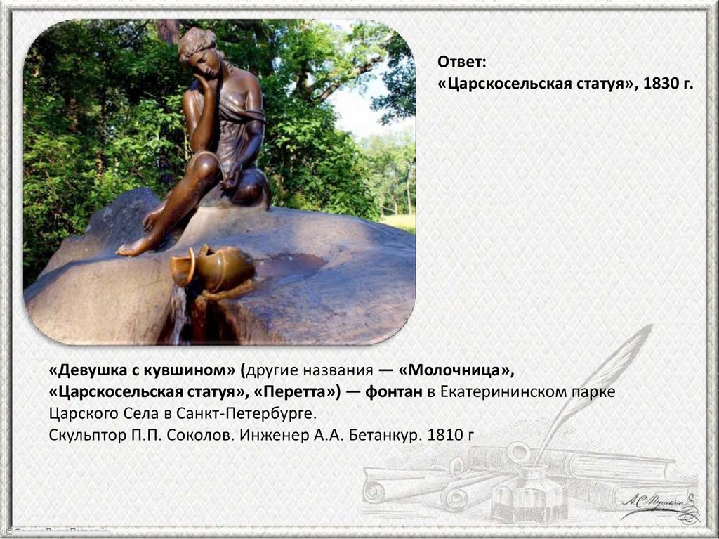 Ответ:«Царскосельская статуя», 1830 г.