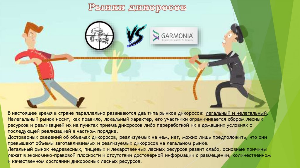 В настоящее время в стране параллельно развиваются два типа рынков дикоросов: легальный и нелегальный.Нелегальный рынок носит, как правило, локальный характер, его участники ограничивается сбором лесных