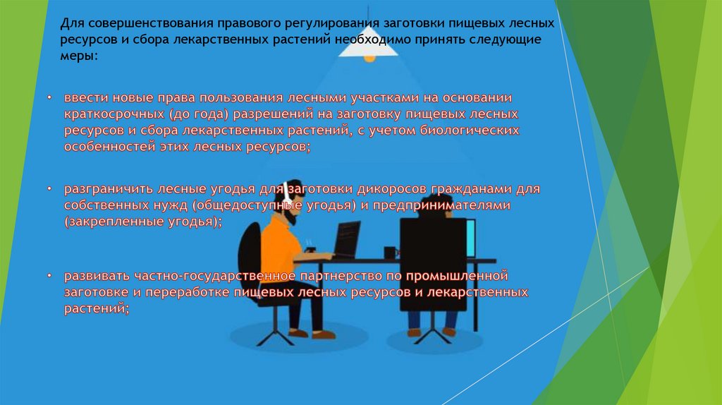 Для совершенствования правового регулирования заготовки пищевых лесныхресурсов и сбора лекарственных растений необходимо принять следующие