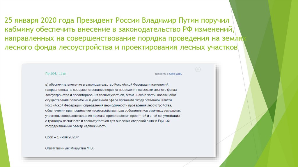 25 января 2020 года Президент России Владимир Путин поручилкабмину обеспечить внесение в законодательство РФ изменений,