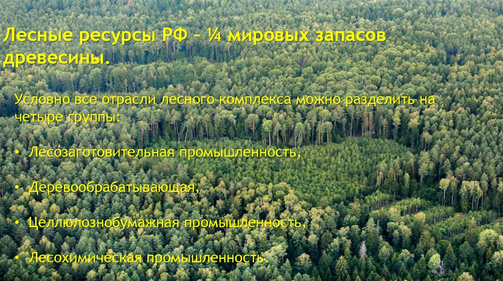 Лесные ресурсы РФ – ¼ мировых запасовдревесины.