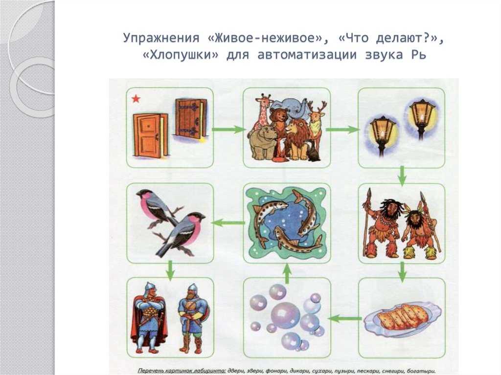 Упражнения «Живое-неживое», «Что делают?»,«Хлопушки» для автоматизации звука Рь
