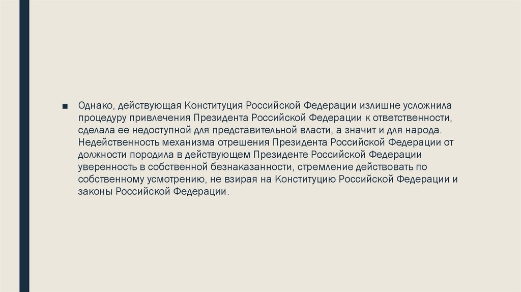 ■ Однако, действующая Конституция Российской Федерации излишне усложнилапроцедуру привлечения Президента Российской Федерации к ответственности,