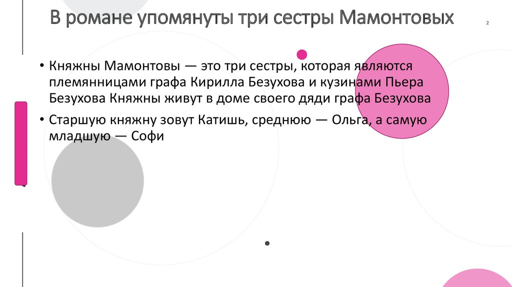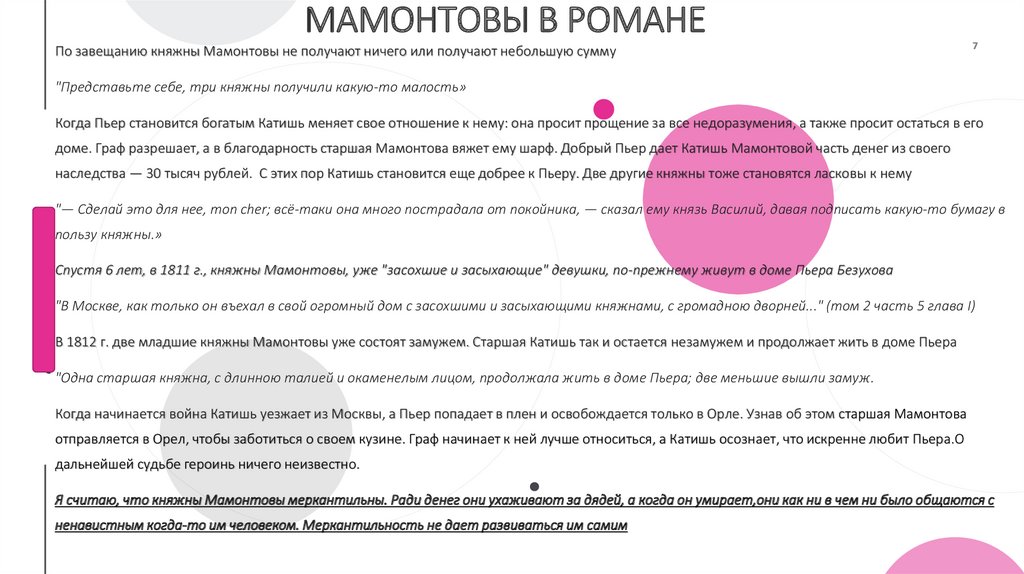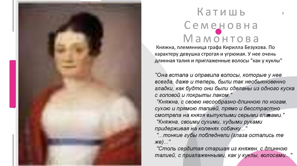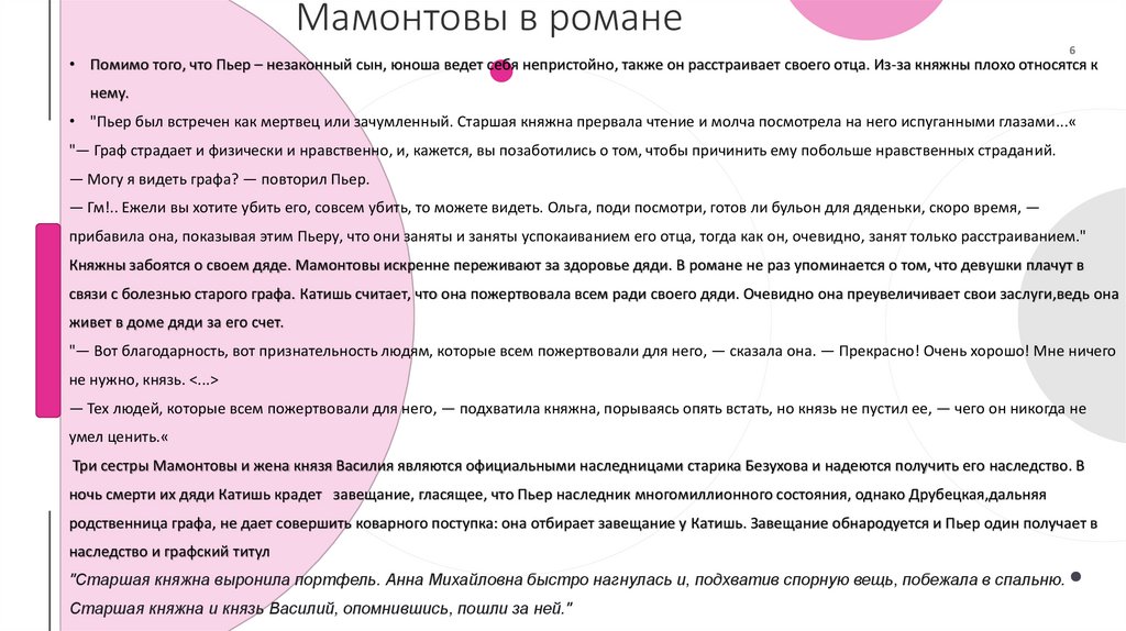 Мамонтовы в романе• Помимо того, что Пьер – незаконный сын, юноша ведет себя непристойно, также он расстраивает своего отца. Из-за княжны плохо относятся к