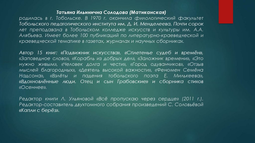 Татьяна Ильинична Солодова (Матиканская)родилась в г. Тобольске. В 1970 г. окончила филологический факультет