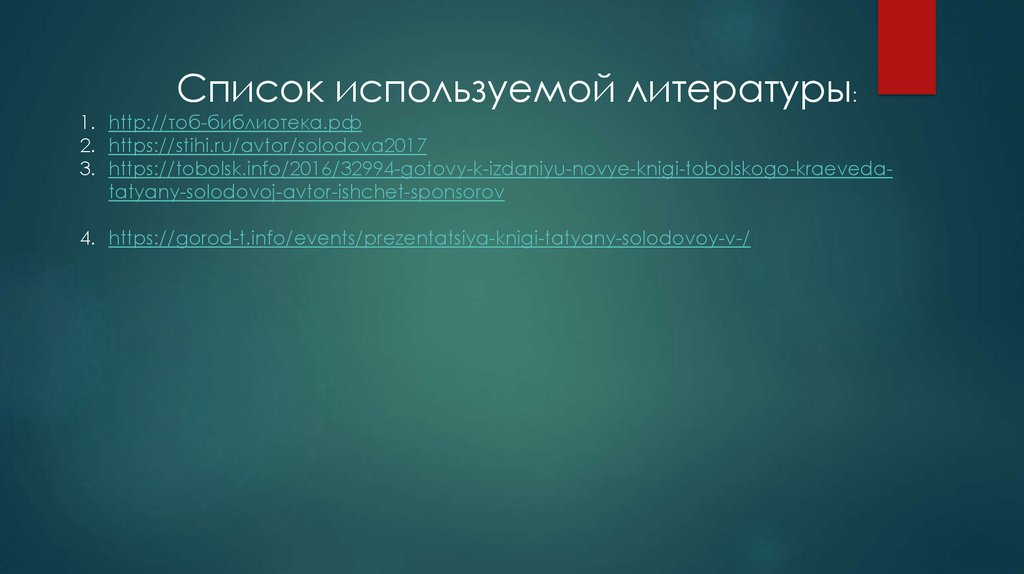 Список используемой литературы:1. http://тоб-библиотека.рф