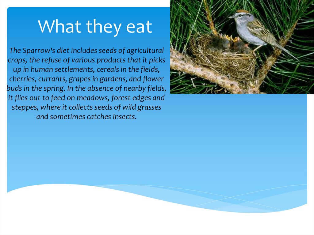 What they eatThe Sparrow's diet includes seeds of agricultural