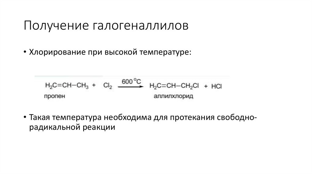 Получение галогеналлилов• Хлорирование при высокой температуре: