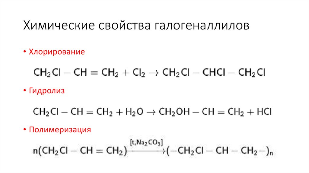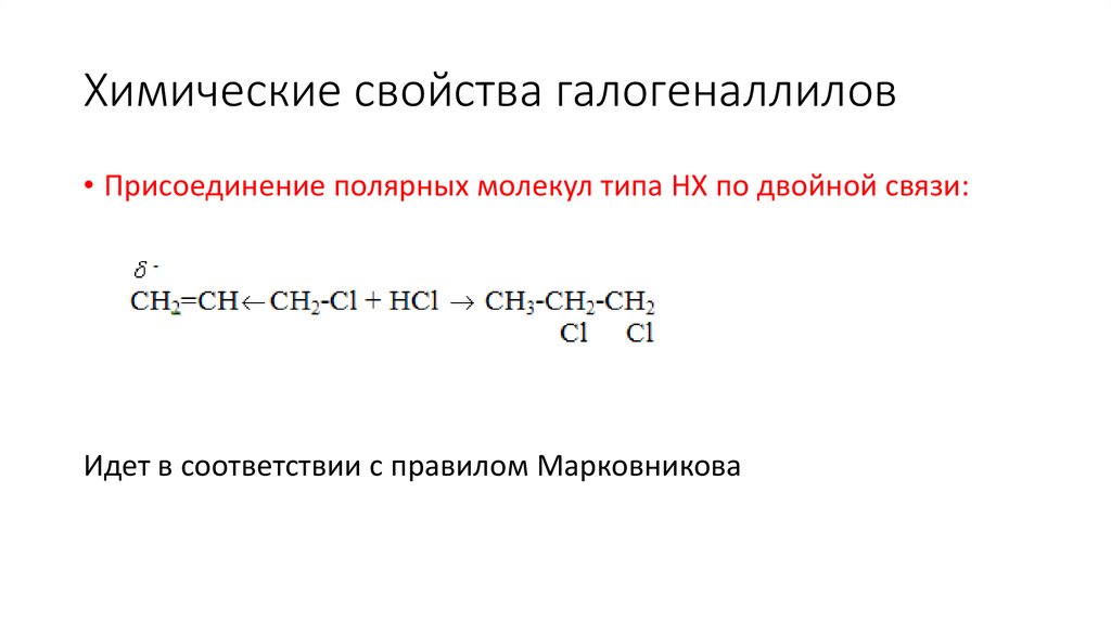 Химические свойства галогеналлилов• Присоединение полярных молекул типа НХ по двойной связи: