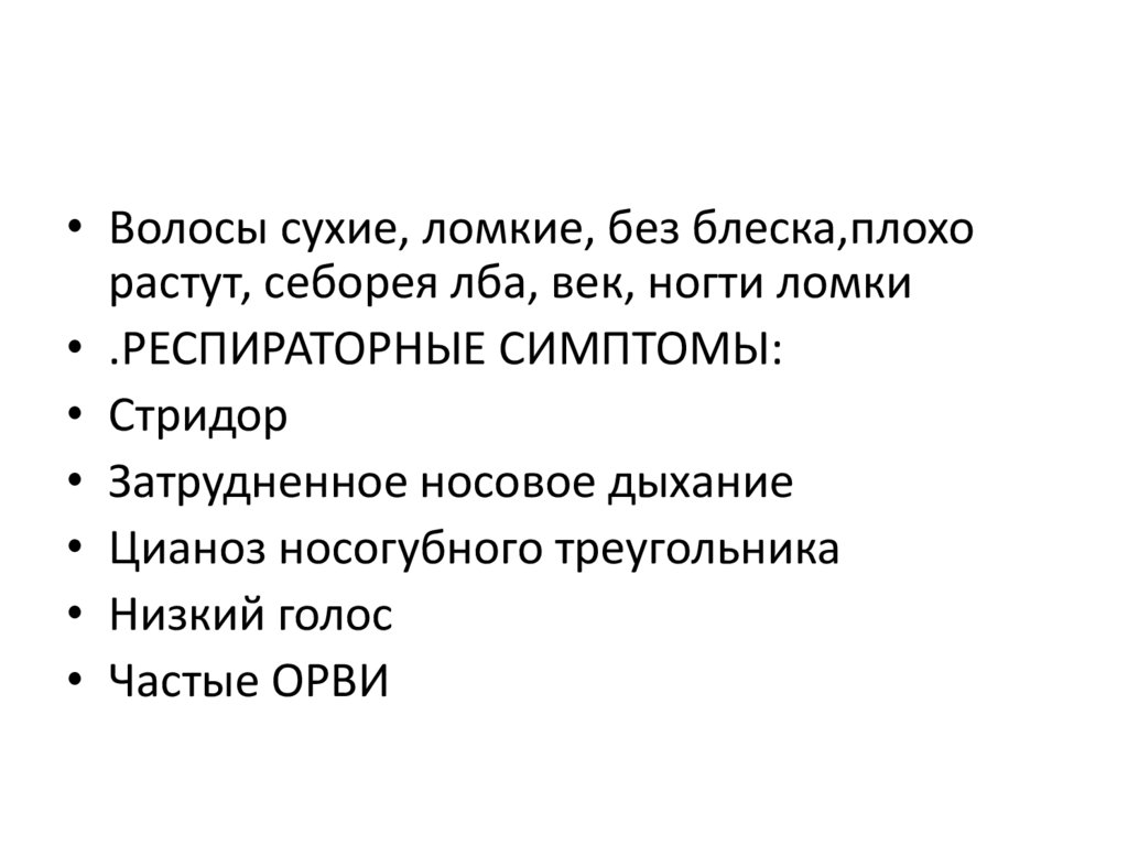 • Волосы сухие, ломкие, без блеска,плохорастут, себорея лба, век, ногти ломки