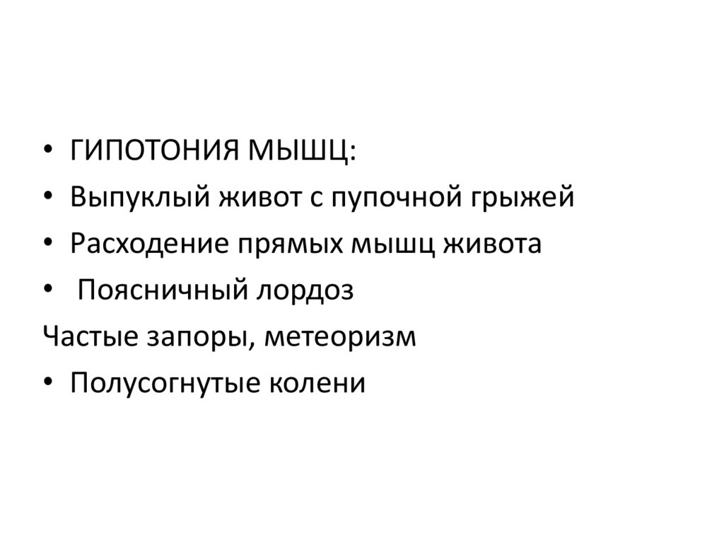 • ГИПОТОНИЯ МЫШЦ:• Выпуклый живот с пупочной грыжей