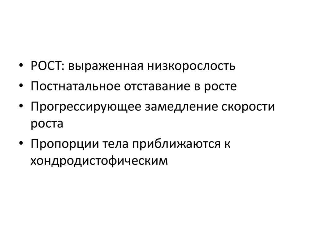 • РОСТ: выраженная низкорослость• Постнатальное отставание в росте