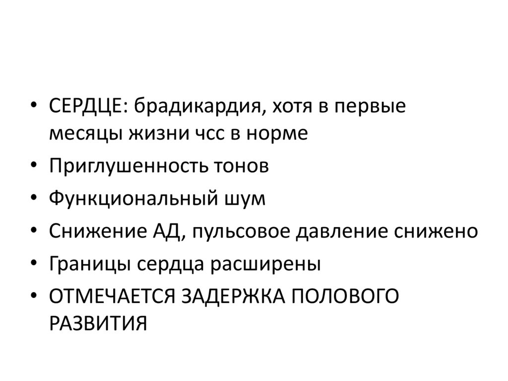 • СЕРДЦЕ: брадикардия, хотя в первыемесяцы жизни чсс в норме